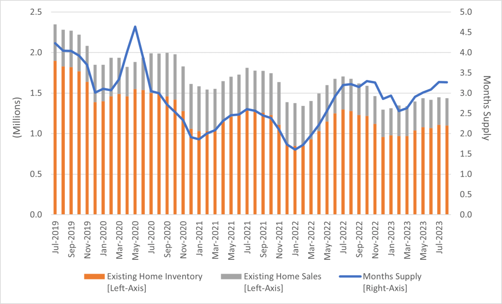 Mortgage rates continued their ascent this week, increasing to 8.0% for a 30-year fixed rate mortgage according to Mortgage News Daily.  As illustrated below, since the Federal Reserve began its latest tightening efforts over the past two years to combat inflation, mortgage rates have more than doubled, exacerbating housing affordability issues in an already supply-constrained market.  Specifically, the chart below illustrates the rising cost of financing the median priced existing home in the United States using a 30-year fixed mortgage rate and a 20% downpayment.  The principal and interest payment breakdown reflects the respective amounts due for a hypothetical borrower’s first monthly payment on the mortgage.  As of August 2023, this total monthly payment was higher by more than 84% relative to two years ago.